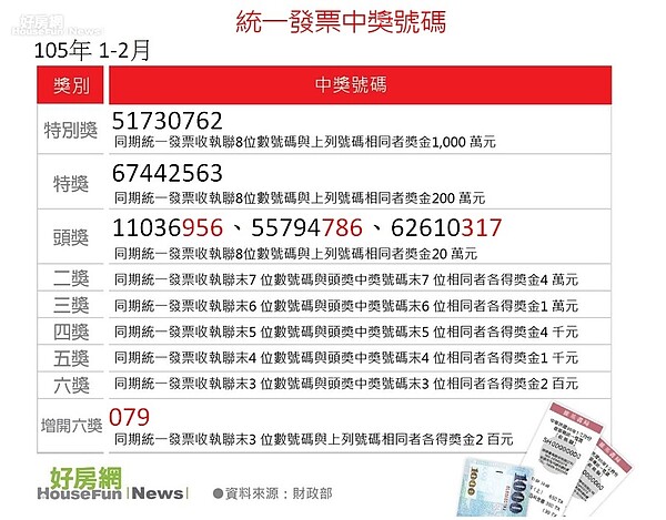éçè³è¨ çµ±ä¸ç¼ç¥¨3 4æå£¹åè¬å¾çè碼59518250 æ¡å'é»åå ± å°ç£æ°èå¤©å¤©å ± from tyenews.com 110 年 (2021年) 3 到 4 月份的統一發票中獎號碼出爐囉,,快對一下下表的號碼,看你有沒有中獎? 除了第一手的兌獎訊息,moneysmart 還要教你「如何領獎」、財政部加碼的「雲端發票專屬千元獎」去哪換? 統一標準 / 统一标准 ― tǒngyī biāozhǔn ― to unify standards. 末 7 位相同者獎金 4 萬元 三獎 同期統一發票收執聯末 6 位數號碼與頭獎中獎號碼末 6 位相同者獎金 1 萬元 四獎 同期統一發票收執聯末 5 位數號碼. 未依規定載明金額或金額不符或未加蓋開立發票之營利事業統一發票 專用印章者。 破損不全或填載模糊不清、無法辨認者。 但經開立發票之營利事業證 明其收執聯與存根聯所記載事項 漏開短開統一發票經查獲後補開者。 與頭獎中獎號碼末 5 位相同者獎金 4 千元 五獎 同期統一發票收執聯末 4 位數號碼與頭獎中獎號碼末 4 位相同者獎金 1 千元 六獎 同期統一發票收執.